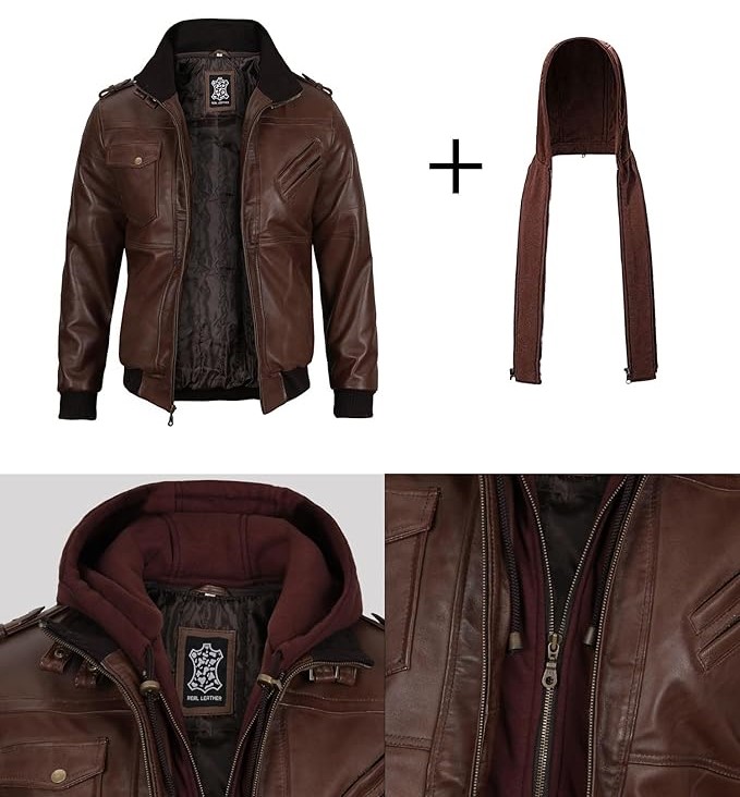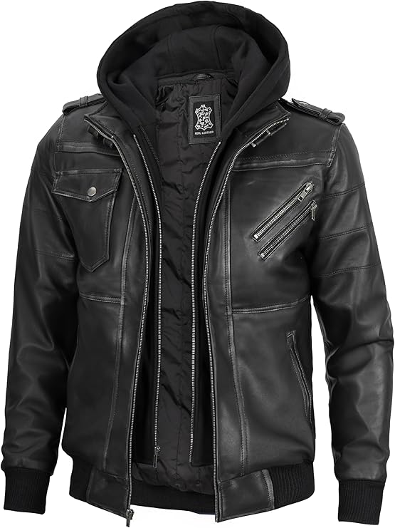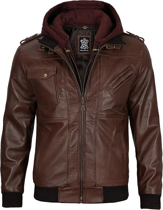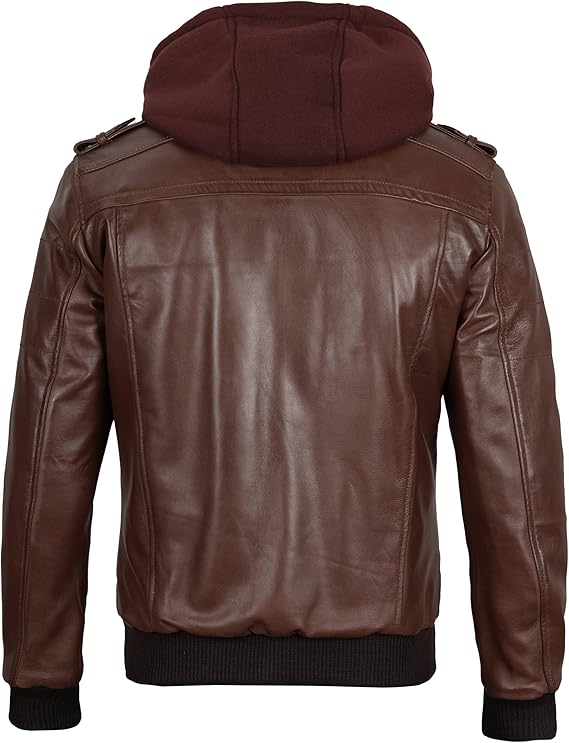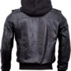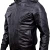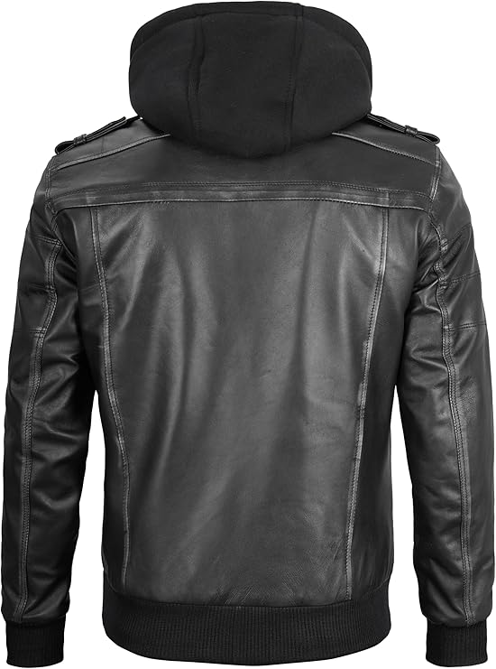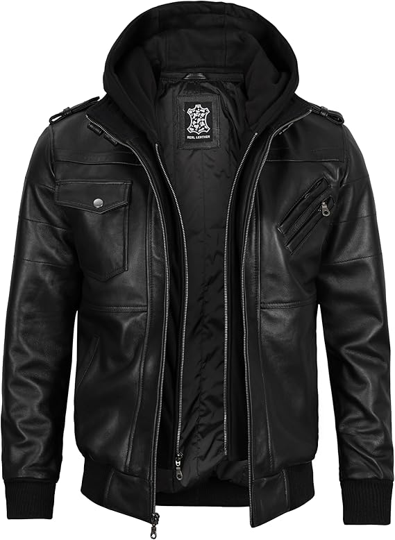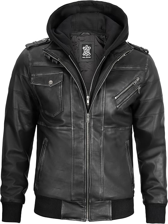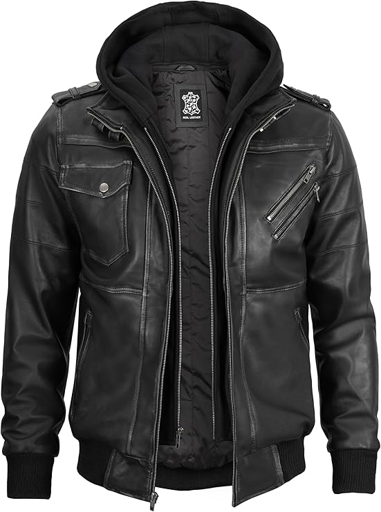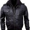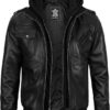 Men’s Genuine Lambskin Leather Bomber Jacket with Removable Hood